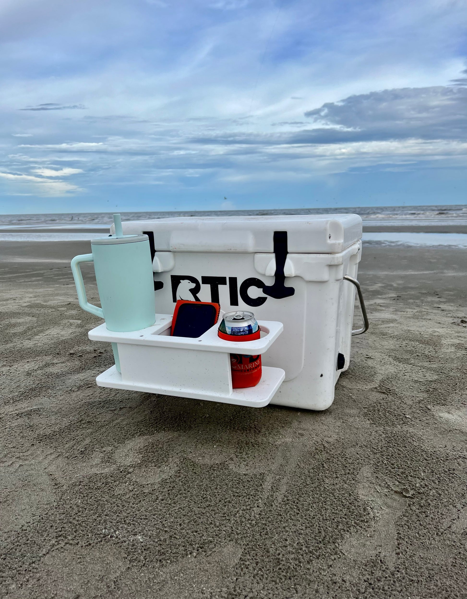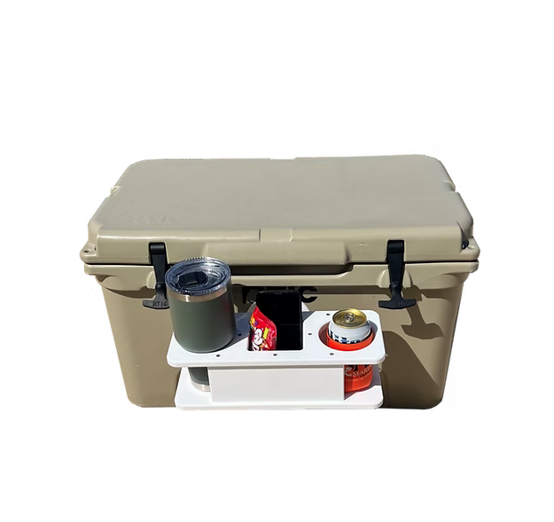Double Cup Holder with center storage helps you stay organized while chilling. Designed to hold 2 cans of your favorite drink, it also features a center storage compartment that is perfect for your phone, wallet, keys, or snack.