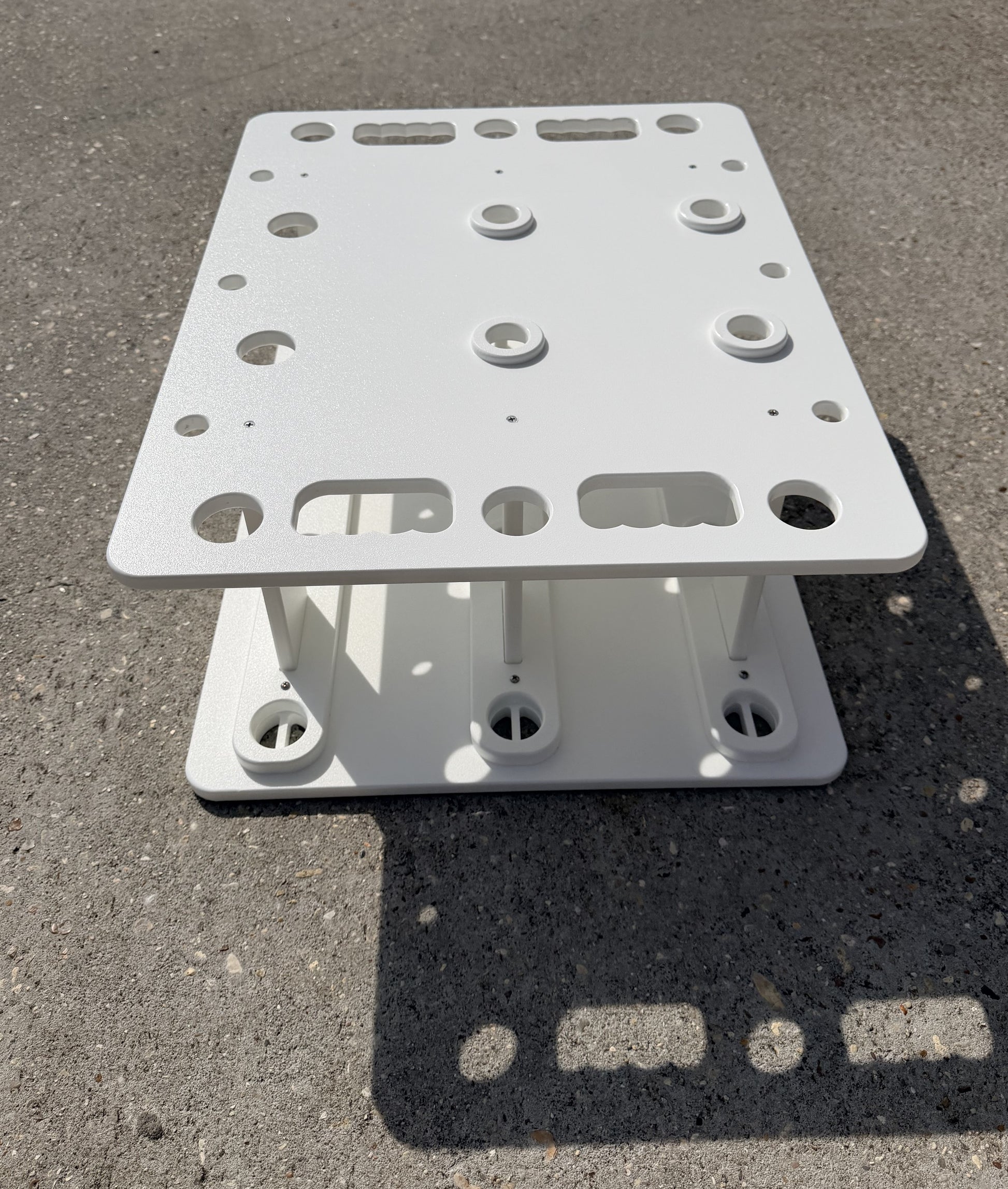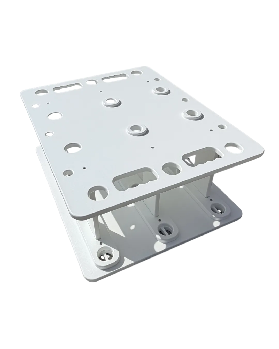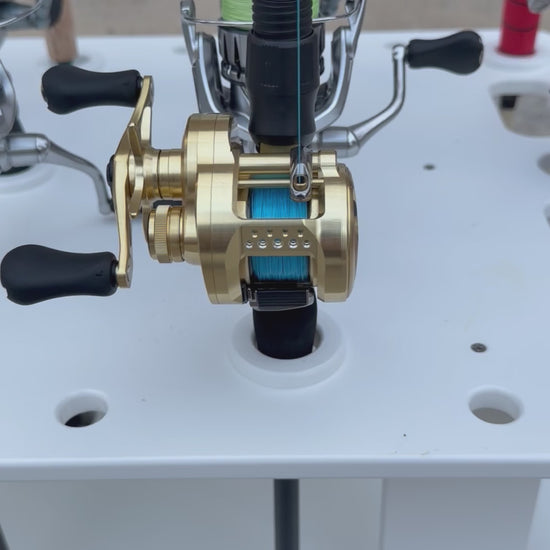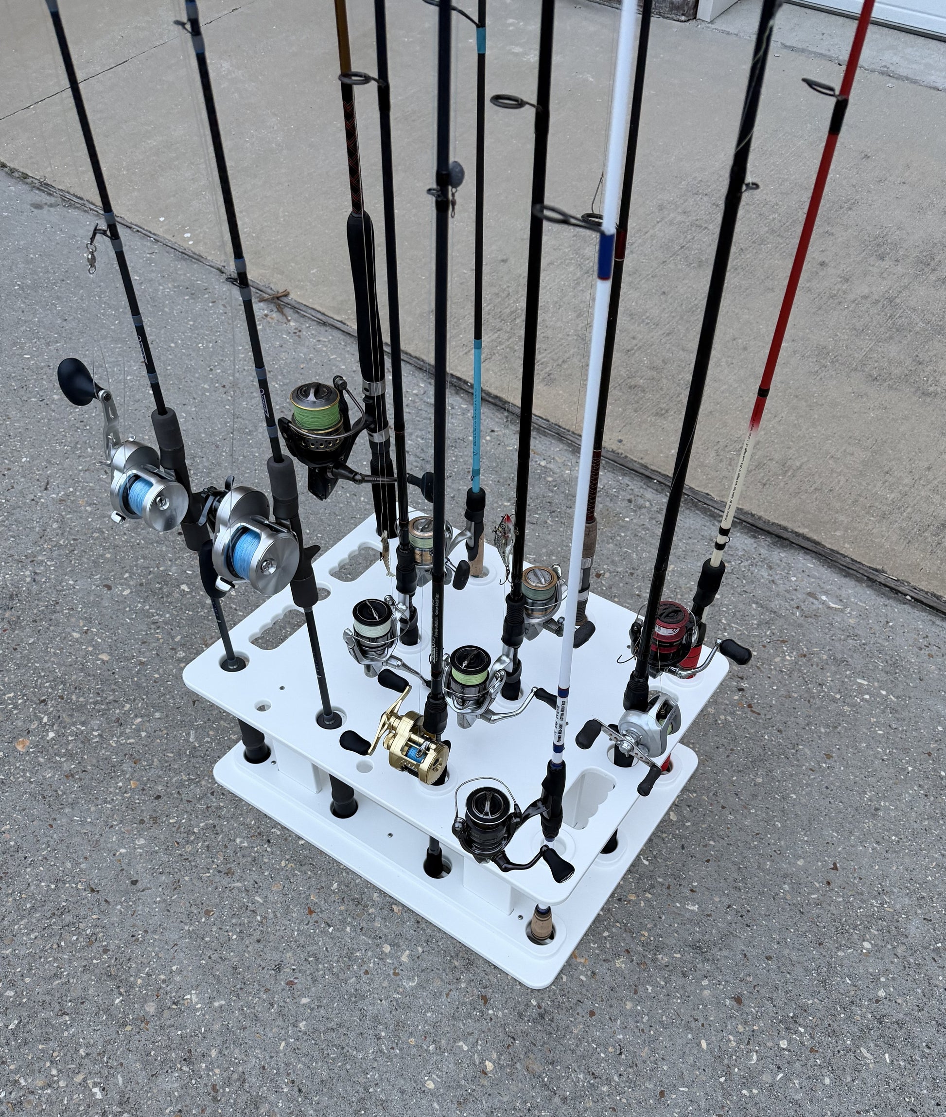 Crafted from marine grade HDPE, this caddie features 12 CNC cut slots with integrated gimbal mounts to keep your rods aligned and securely in place. Four heavy duty handles make it easy to carry and also serve as convenient tie-down points for securing it to your truck bed or dock.